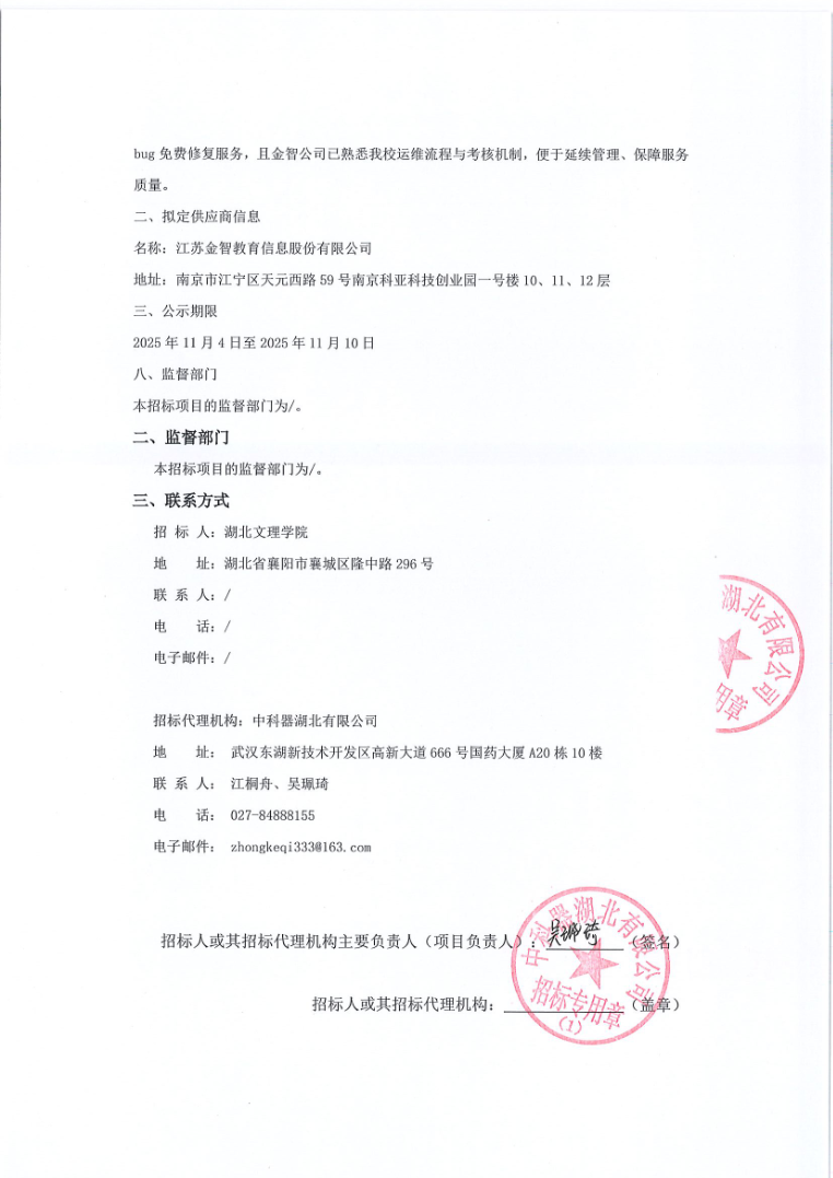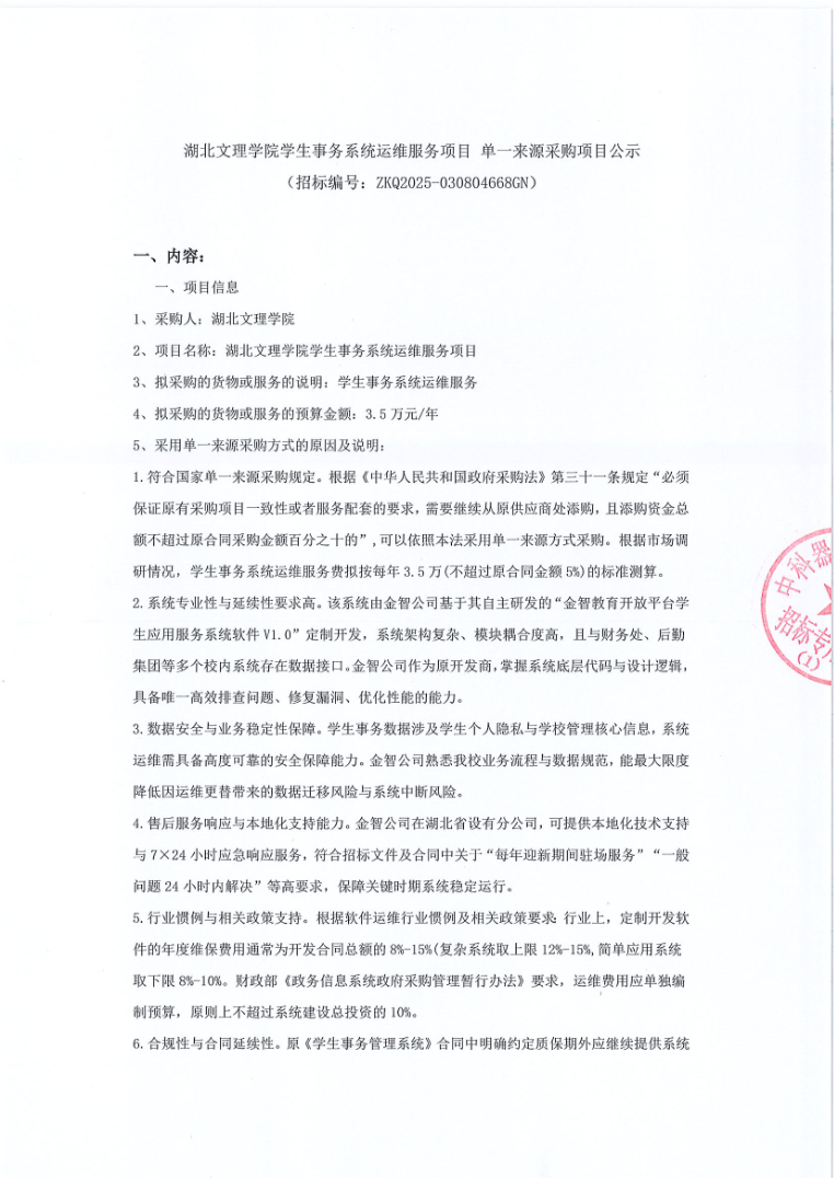 湖北文理学院学生事务系统运维服务项目 单一来源采购项目公示